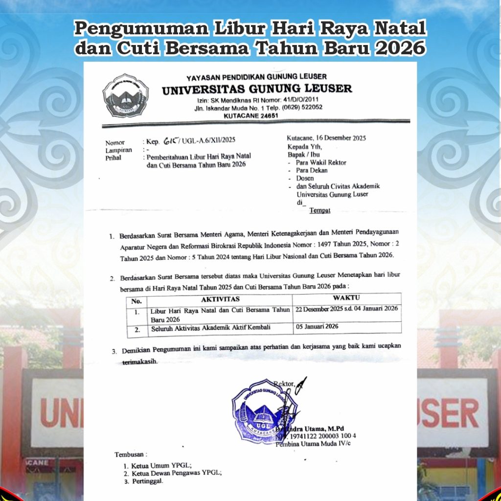 December 21, 2025 by admin 0 AkademikPengumuman Libur Hari Raya Natal dan Cuti Bersama Tahun Baru 2026 PENGUMUMAN LIBUR AKADEMIK Read more December 19, 2025 by admin 0 Akademik, HumasTingkatkan Kompetensi Akademik, UGL Gelar Diskusi Bersama Guru Besar UINSU Read more December 18, 2025 by admin 0 KerjasamaUGL Jalin Kerja Sama Dengan Klikto ID, Teken MoU Sambut Era Digital dan Kecerdasan Buatan Read more December 17, 2025 by admin 0 Fakultas Keguruan dan Ilmu PendidikanFKIP UGL Selenggarakan Microteaching sebagai pembekalan PPL Mahasiswa Read more December 5, 2025 by admin 0 Humas, KemahasiswaanAliansi Mahasiswa UGL Gelar Aksi Peduli, Salurkan Bantuan Untuk Korban Bencana di Ketambe, Kabupaten Aceh Tenggara Read more December 5, 2025 by admin 0 Fakultas TeknikBEM Fakultas Teknik UGL Salurkan Bantuan Untuk Korban Banjir Bandang di Kute Simpur Jaya, Kecamatan Ketambe, Kabupaten Aceh Tenggara Read more December 3, 2025 by admin 0 KerjasamaUniversitas Gunung Leuser Tandatangani MoU Dengan INTI International University, Kolej Dar Al-Hikmah, dan Pondok Unais di Malaysia Read more 7/7