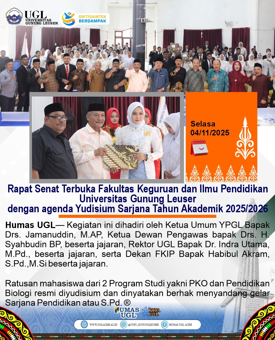 February 14, 2026 by admin 0 Akademik, PengumumanPENGUMUMAN LIBUR & CUTI BERSAMA IMLEK DAN MENYAMBUT BULAN RAMADHAN TAHUN 1447 H/2026 M Read more January 9, 2026 by admin 0 Akademik, KemahasiswaanUGL Bagikan Buku Tabungan Kartu Indonesia Pintar Kepada 282 Mahasiswa Baru Tahun Akademik 2025/2026 Read more December 21, 2025 by admin 0 AkademikPengumuman Libur Hari Raya Natal dan Cuti Bersama Tahun Baru 2026 PENGUMUMAN LIBUR AKADEMIK Read more December 19, 2025 by admin 0 Akademik, HumasTingkatkan Kompetensi Akademik, UGL Gelar Diskusi Bersama Guru Besar UINSU Read more November 25, 2025 by admin 0 Akademik, Kemahasiswaan, KerjasamaProdi Pendidikan Biologi FKIP Universitas Gunung Leuser Mengikuti PKM Internasional Bersama UniSIRAJ di Malaysia, Angkat Isu Pengelolaan Sampah Organik Read more November 8, 2025 by admin 0 Akademik, HumasUniversitas Gunung Leuser Gelar Wisuda Angkatan Ke-XI Tahun 2025 Read more November 4, 2025 by admin 0 Akademik, Fakultas Keguruan dan Ilmu PendidikanRapat Senat Terbuka FKIP Universitas Gunung Leuser Dengan Agenda Yudisium Sarjana Tahun Akademik 2025/2026 Read more November 4, 2025 by admin 0 Akademik, Fakultas PertanianRapat Senat Terbuka Fakultas Pertanian UGL Dengan Agenda Yudisium Sarjana Tahun Akademik 2025/2026 Read more November 3, 2025 by admin 0 Akademik, Fakultas EkonomiRapat Senat Terbuka Fakultas Ekonomi UGL Dengan Agenda Yudisium Sarjana Tahun Akademik 2025/2026 Read more October 11, 2025 by admin 0 Akademik, Humas, SeminarUGL Gelar Dialog Konsultatif Akreditasi dan Persiapan Penegerian Read more Posts pagination 1 2 Next 10/18
