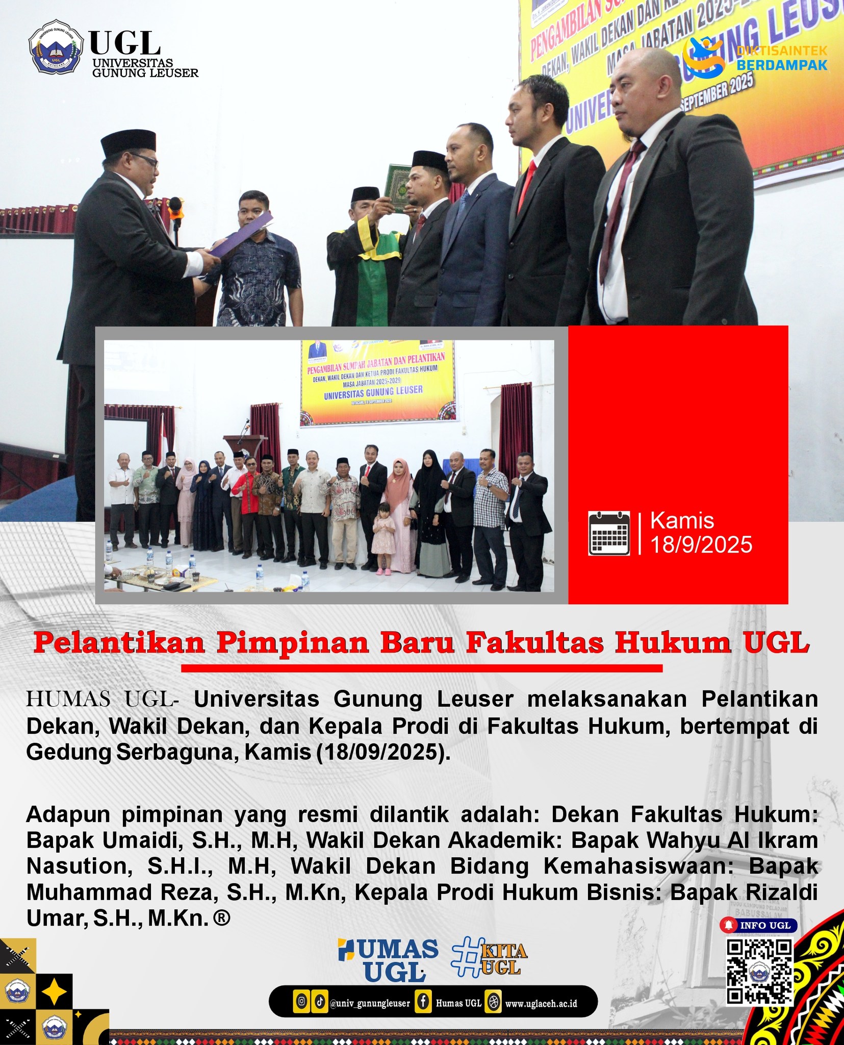 September 18, 2025 by admin 0 Fakultas HukumPelantikan Pimpinan Baru Fakultas Hukum UGL Tahun 2025 Read more 1/1