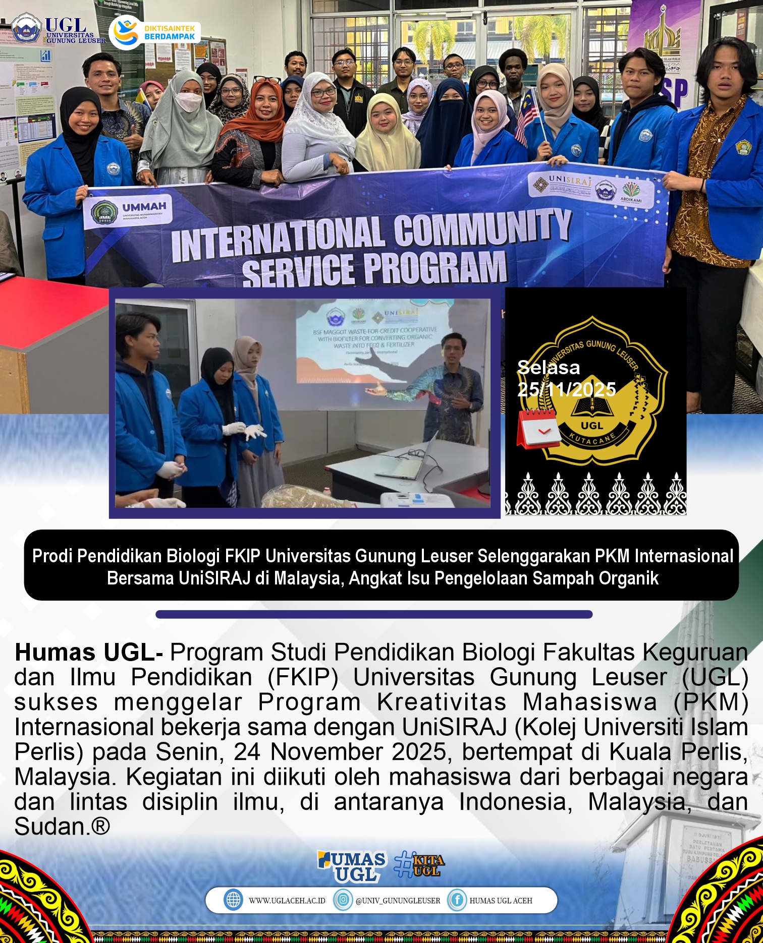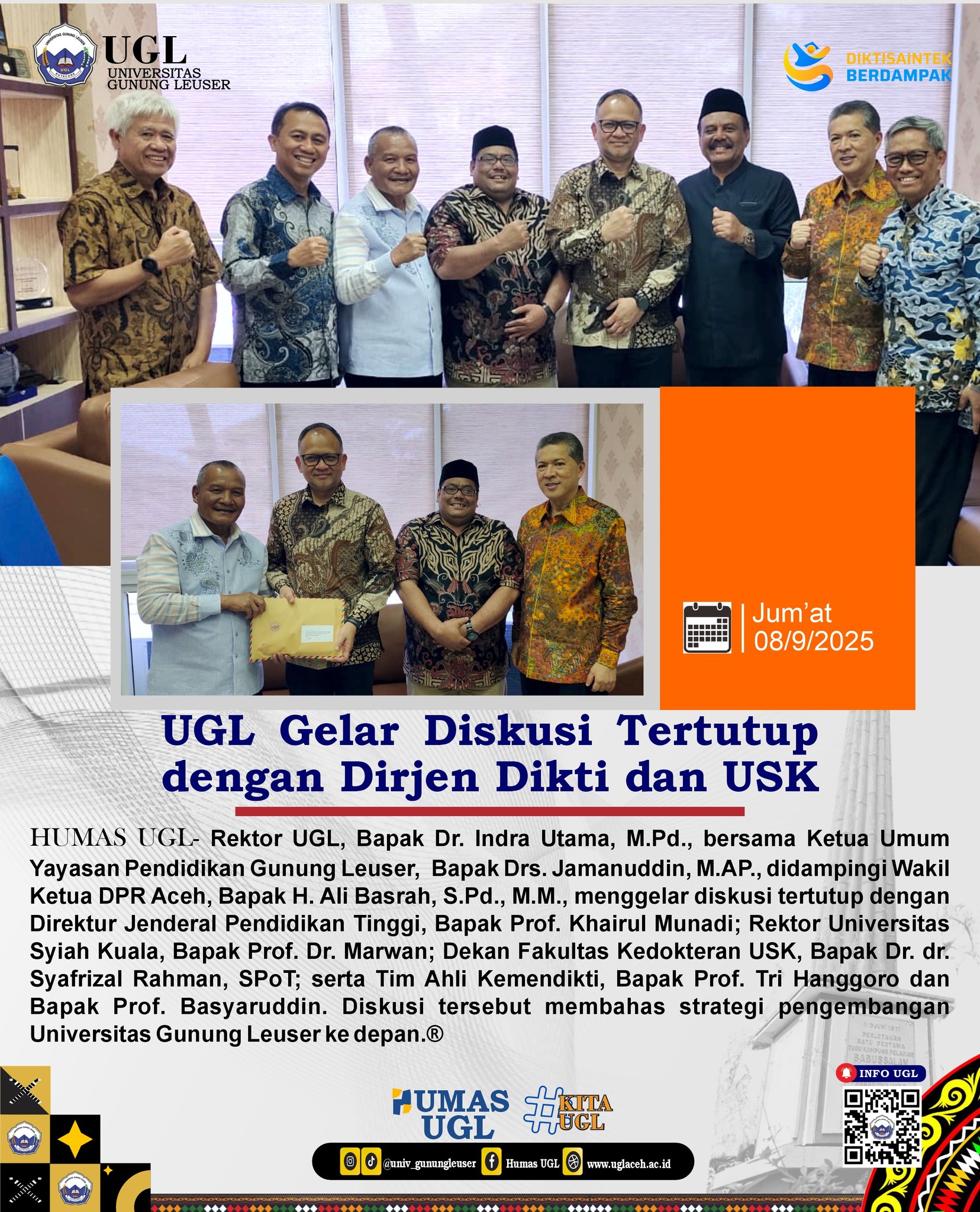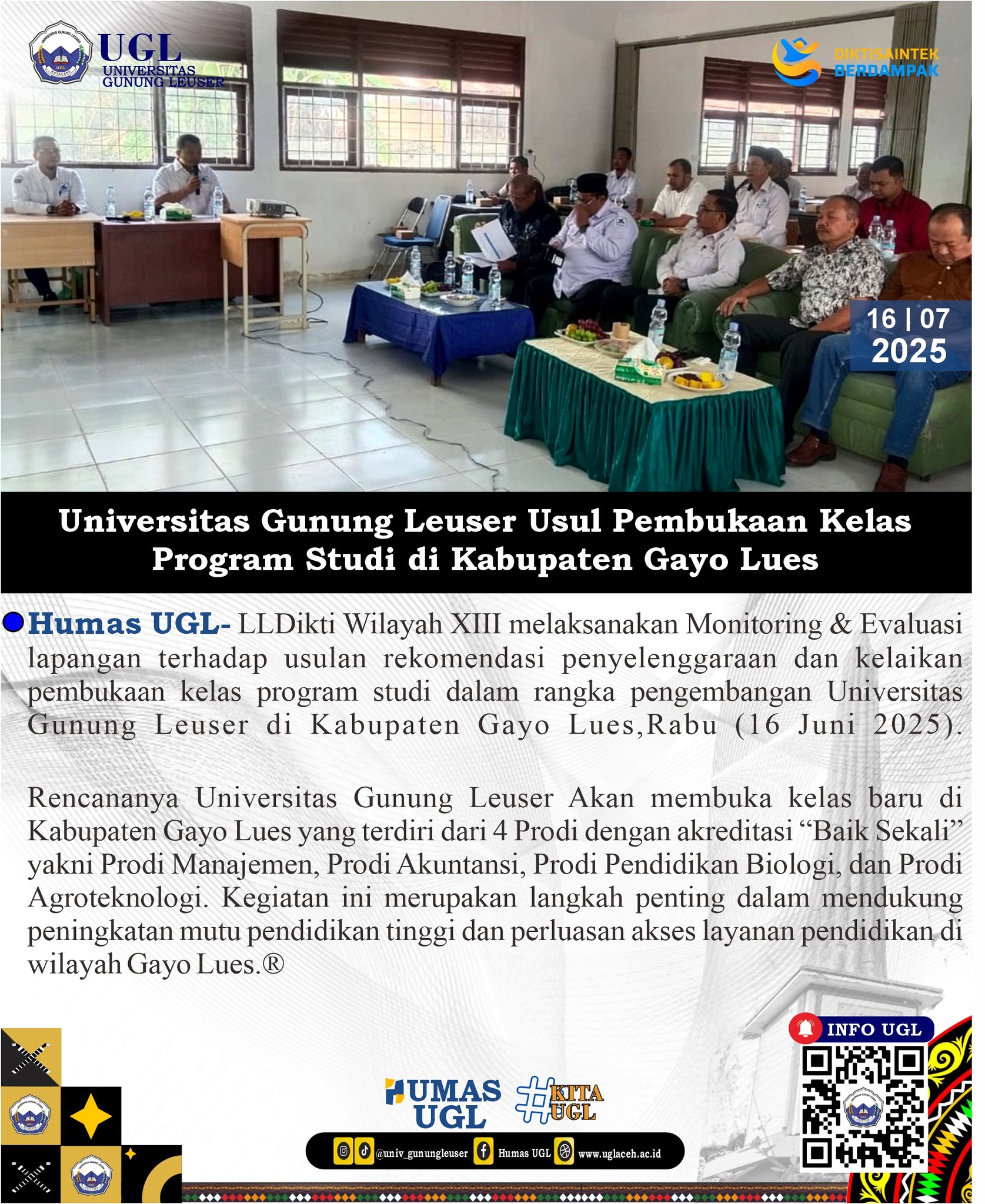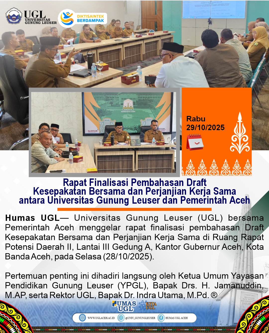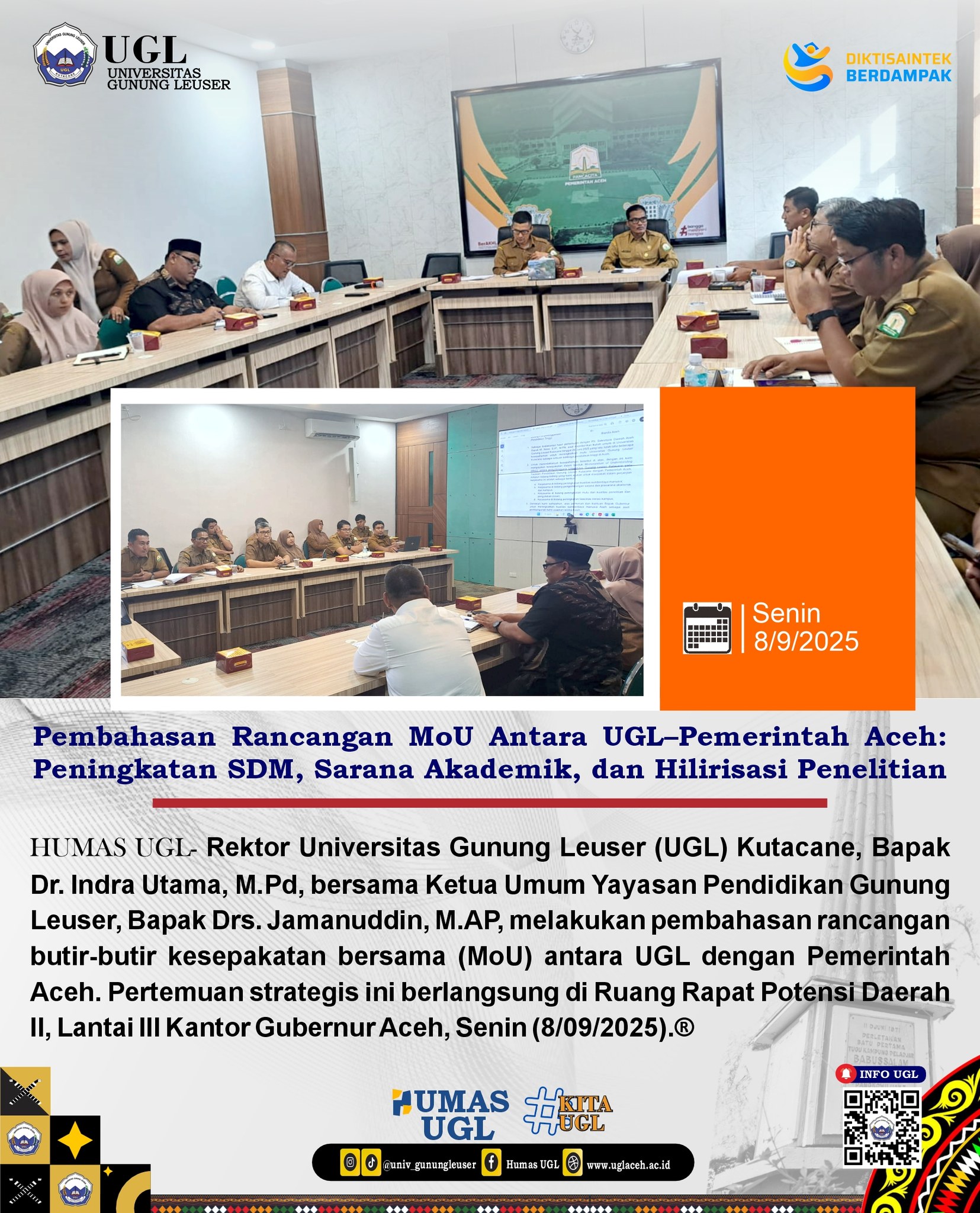 December 18, 2025 by admin 0 KerjasamaUGL Jalin Kerja Sama Dengan Klikto ID, Teken MoU Sambut Era Digital dan Kecerdasan Buatan Read more December 3, 2025 by admin 0 KerjasamaUniversitas Gunung Leuser Tandatangani MoU Dengan INTI International University, Kolej Dar Al-Hikmah, dan Pondok Unais di Malaysia Read more November 25, 2025 by admin 0 Akademik, Kemahasiswaan, KerjasamaProdi Pendidikan Biologi FKIP Universitas Gunung Leuser Mengikuti PKM Internasional Bersama UniSIRAJ di Malaysia, Angkat Isu Pengelolaan Sampah Organik Read more October 29, 2025 by admin 0 KerjasamaRapat Finalisasi Pembahasan Draft Kesepakatan Bersama dan Perjanjian Kerja Sama Antara UGL Dengan Pemerintah Aceh Read more September 8, 2025 by admin 0 KerjasamaUGL Gelar Diskusi Tertutup Dengan Dirjen Dikti dan USK Read more August 13, 2025 by admin 0 KerjasamaUGL Melakukan Pertemuan Dengan Pemerintah Aceh Terkait Strategi Pengembangan UGL Read more August 8, 2025 by admin 0 Humas, KerjasamaUGL Gelar Diskusi Tertutup Dengan Dirjen Dikti dan USK Read more August 8, 2025 by admin 0 Humas, KerjasamaPembahasan Rancangan MoU Antara UGL-Pemerintah Aceh Read more July 17, 2025 by admin 0 KerjasamaUGL Tandatangani MoU Dengan Pemerintah Kabupaten Gayo Lues Read more July 16, 2025 by admin 0 Akademik, Humas, KerjasamaUGL Usul Pembukaan Kelas Program Studi di Kabupaten Gayo Lues Read more 10/10