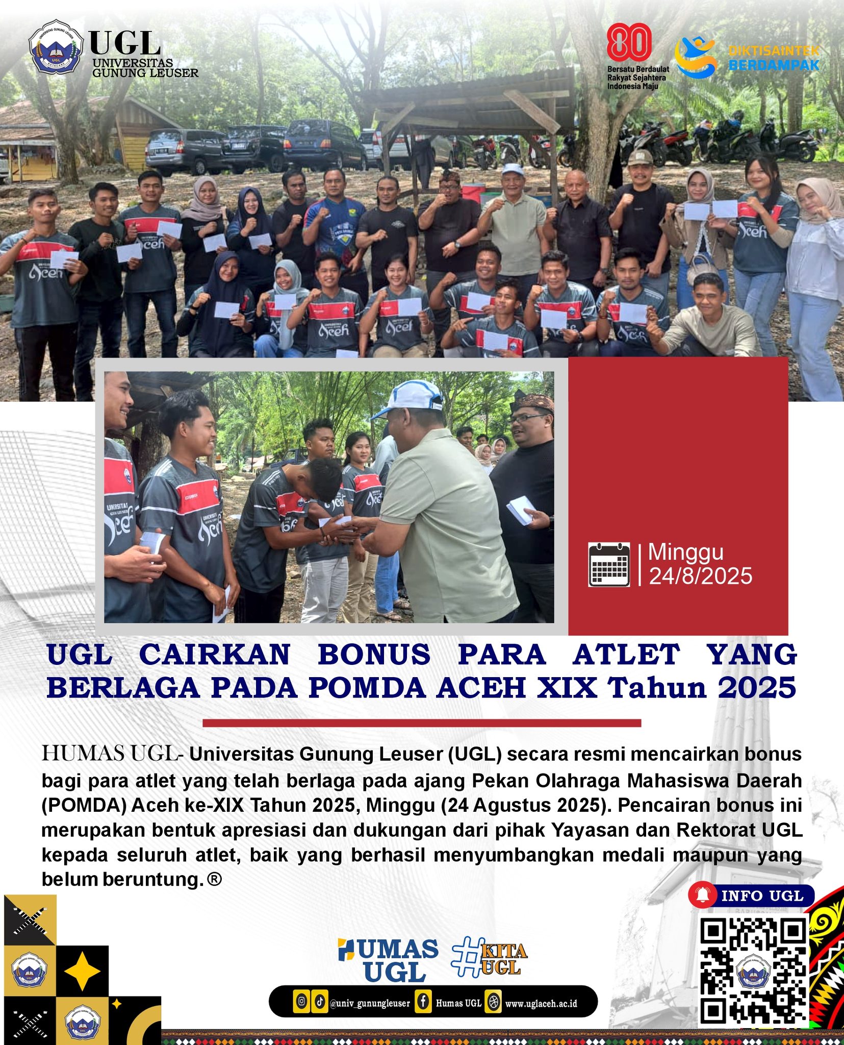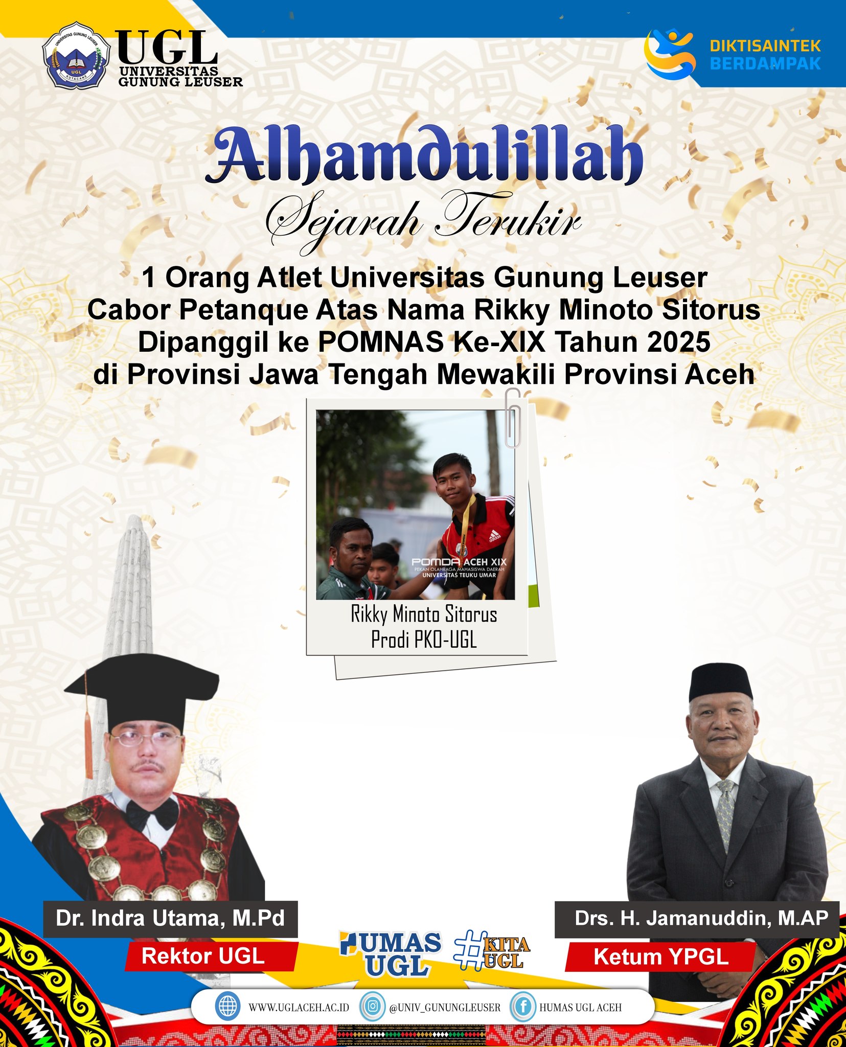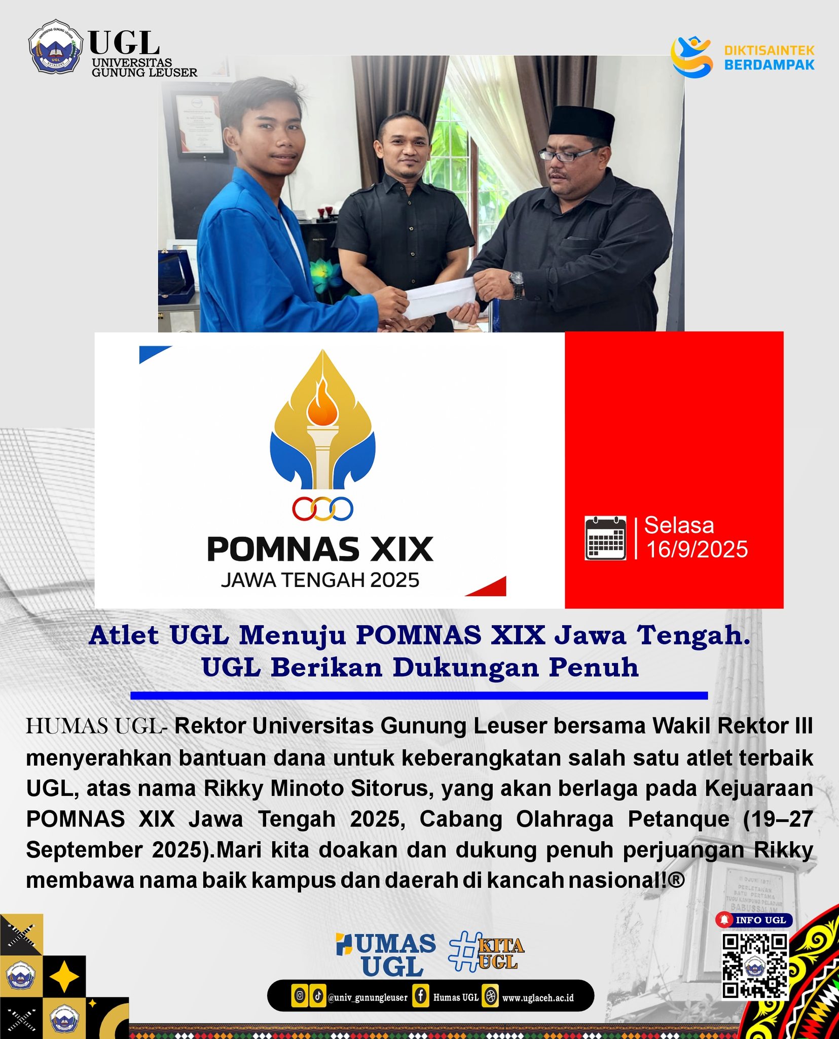 September 16, 2025 by admin 0 Kemahasiswaan, PrestasiAtlet UGL Menuju POMNAS XIX Jawa Tengah, UGL Berikan Dukungan Penuh Read more August 24, 2025 by admin 0 Fakultas Keguruan dan Ilmu Pendidikan, Kemahasiswaan, PrestasiUGL Cairkan Bonus Para Atlet yang Berlaga Pada POMDA Aceh XIX Tahun 2025 Read more July 29, 2025 by admin 0 Kemahasiswaan, PrestasiAtlet Universitas Gunung Leuser Dipanggil ke POMNAS Ke-XIX Tahun 2025 Mewakili Provinsi Aceh Read more 3/3